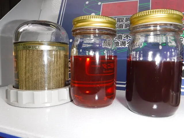 左から順に、NUTEC NC-65の新油、オーバーフロー時に採取した現在ミッションの中を流れているオイル、最初にドレンアウトしたオイルの順です。