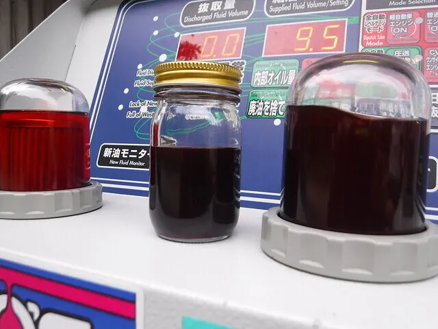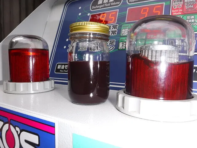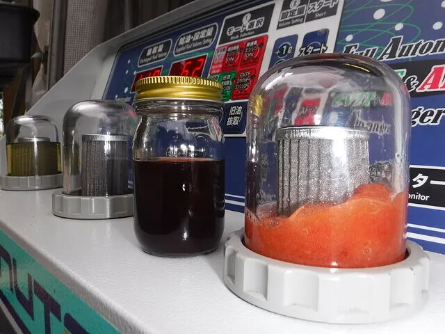 右の廃油モニター内のオイルの赤みが薄くなってきましたね。