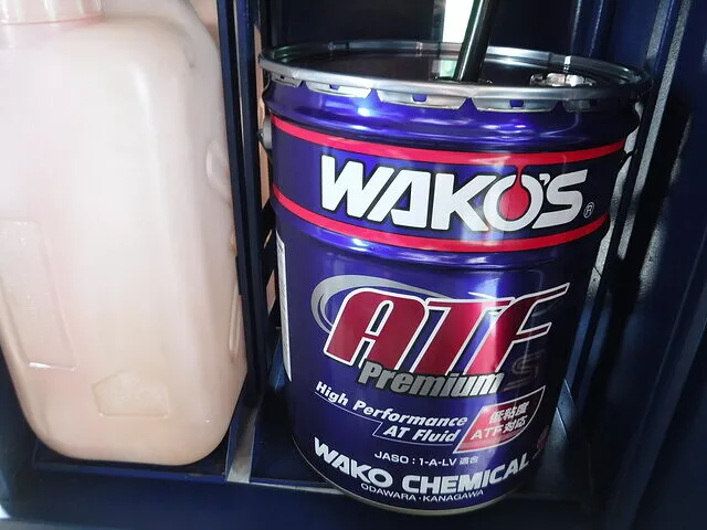 車両とトルコン太郎を接続し、初期補充分(下抜き分)は当社オリジナルのフルードを注入後、オーナー様のご希望のワコーズATFプレミアムSをトルコン太郎にセット。