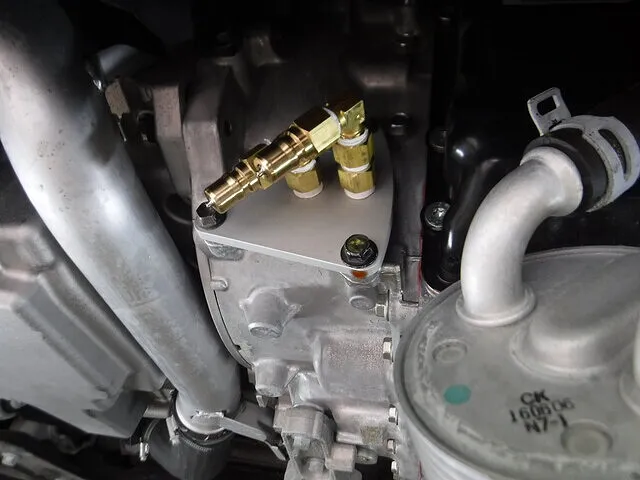 ドレンアウトしないので、ヒートエクスチェンジャーを取り外す際に現状のフルードをビンに採取。
