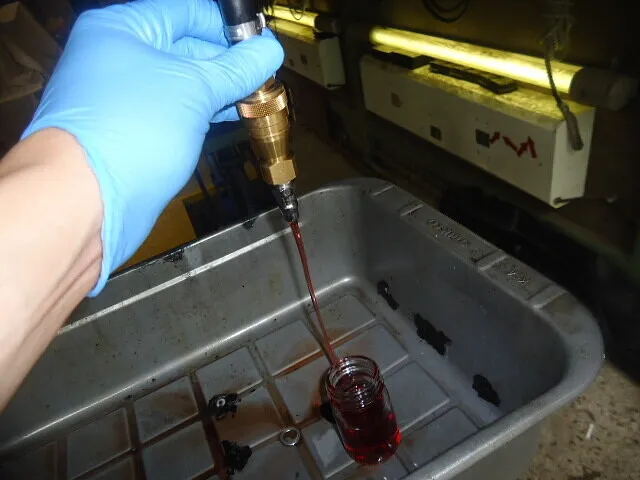 ゲージ付き車ですのでホースを外す際に比色用にビンに採取します。