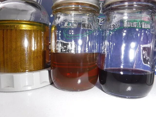 左から順に、ワコーズATFプレミアムスペックの新油、オーバーフロー時に採取した現在ミッションの中を流れているオイル、最初にドレンアウトしたオイルの順です。