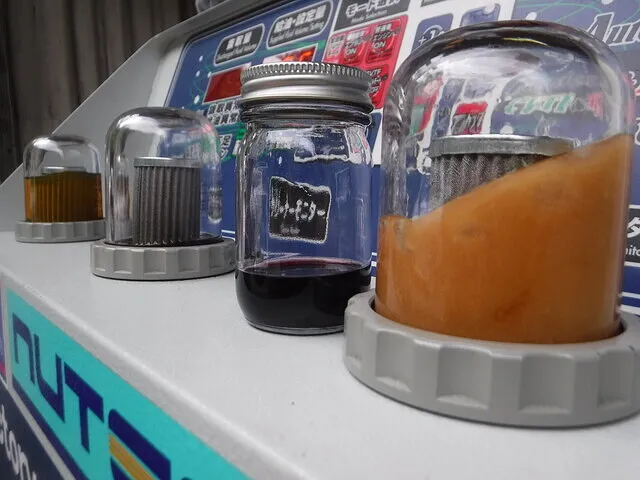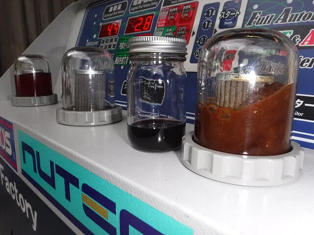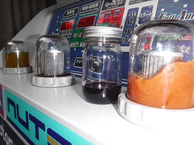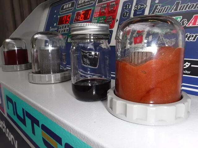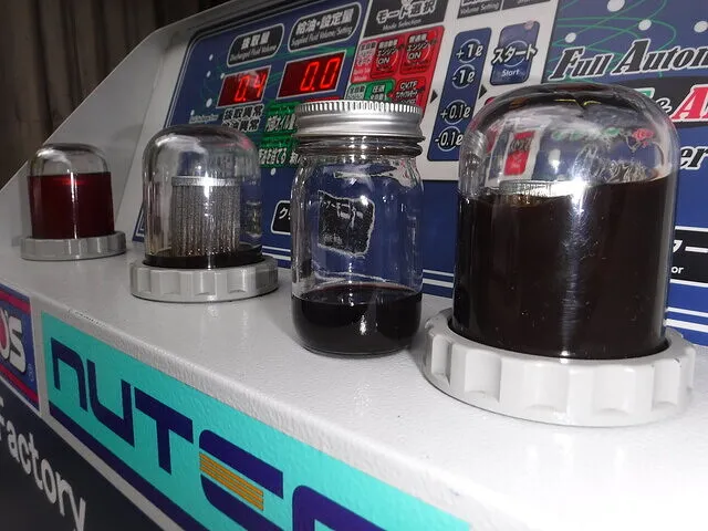 ビンに採取したオイルと、右のクリーナーモニター内のオイルは同一のものになります。