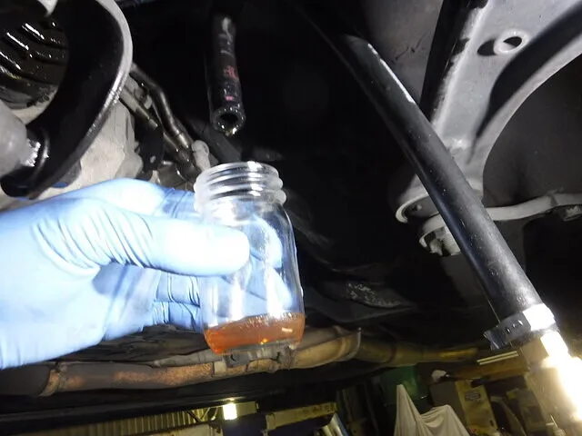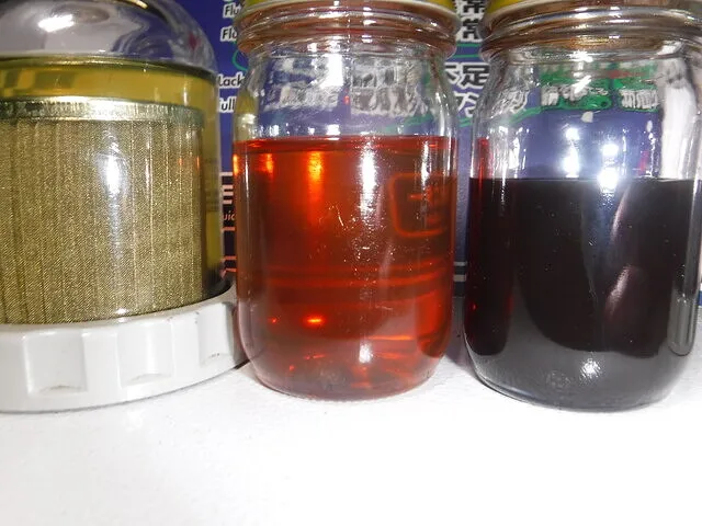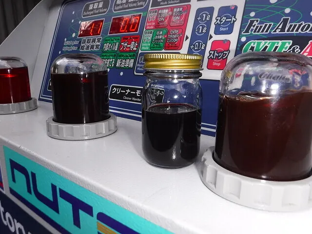 左から順に、NUTEC NC-65の新油、ホースを外す際に採取した現在ミッションの中を流れているオイル、最初にドレンアウトしたオイルの順です。
