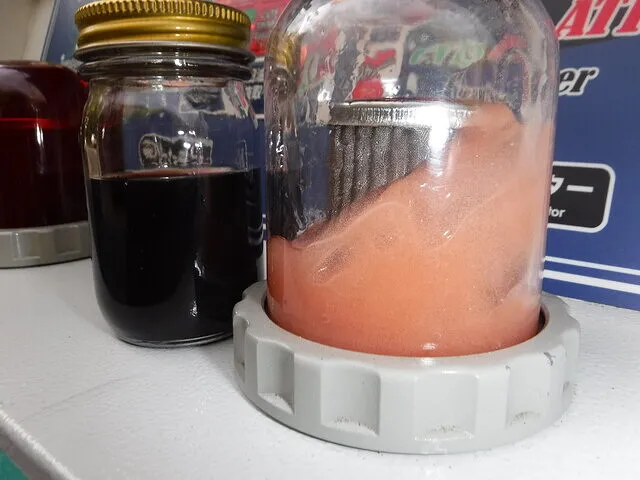 真ん中のビンのドレンアウト時に採取したオイルと画像右側の現在ミッションの中を流れているオイルを見比べると赤みは少し出ましたね。