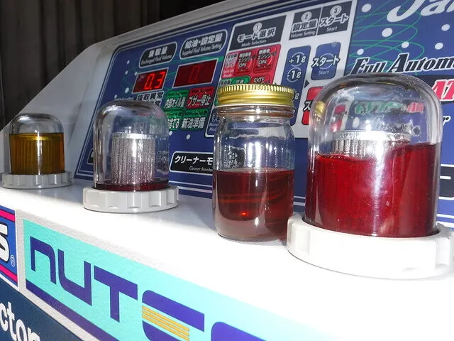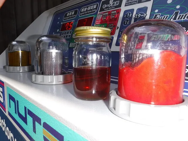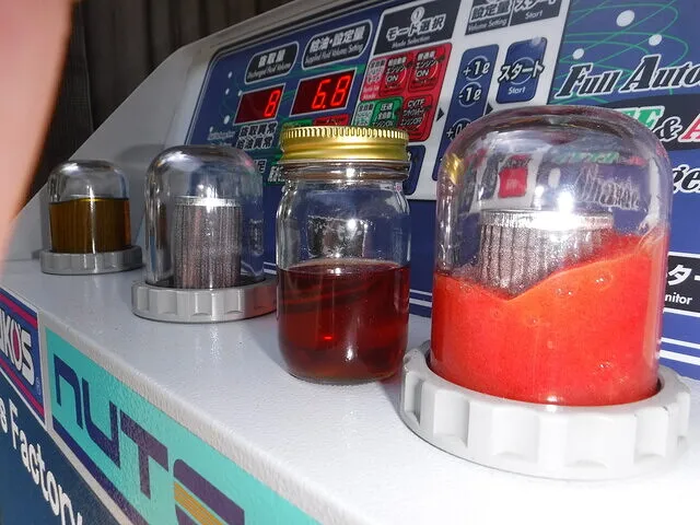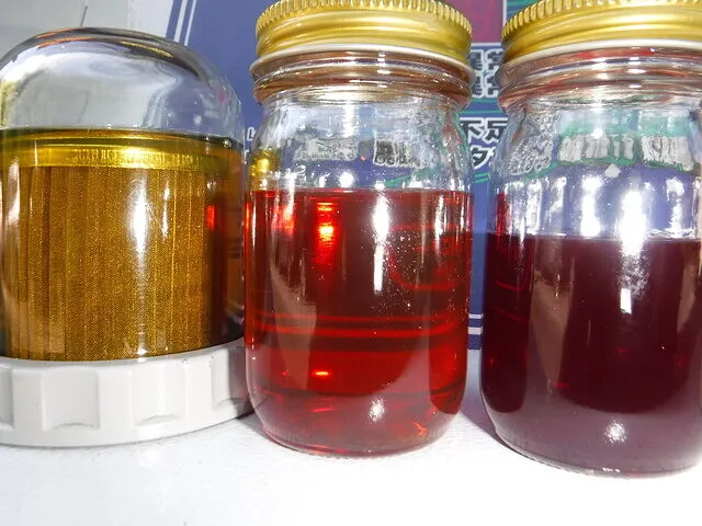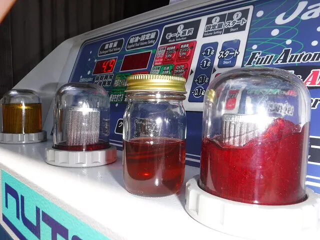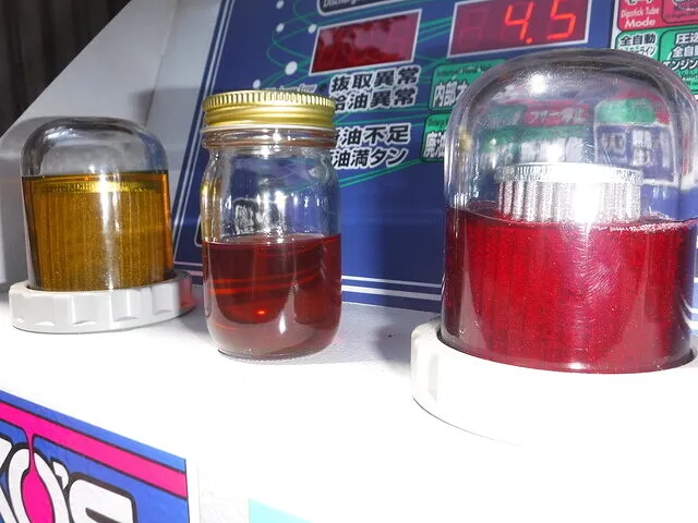 右の廃油モニター内のオイルの色味が徐々にワコーズATFプレミアムスペックの飴色が混ざり、オレンジ色になっていきますね。
