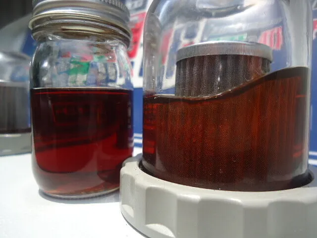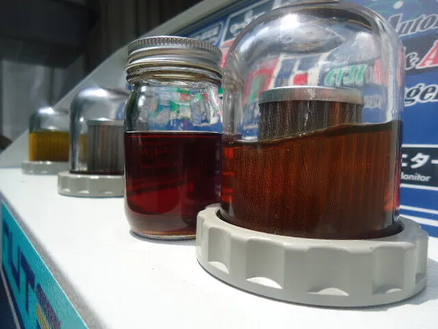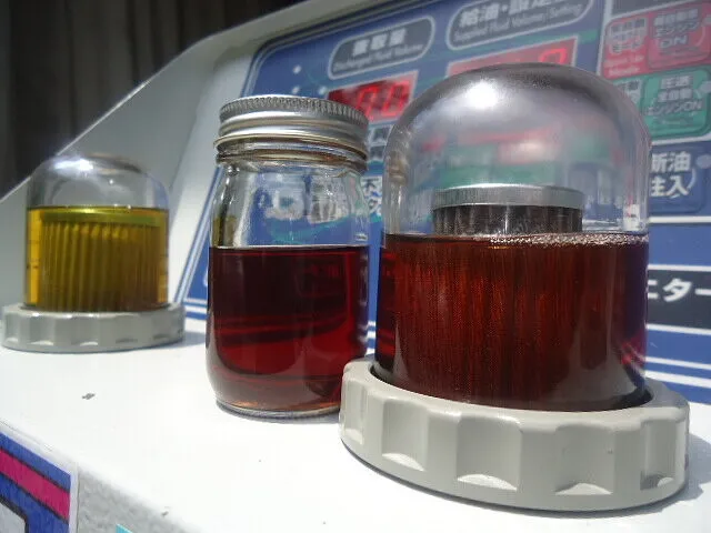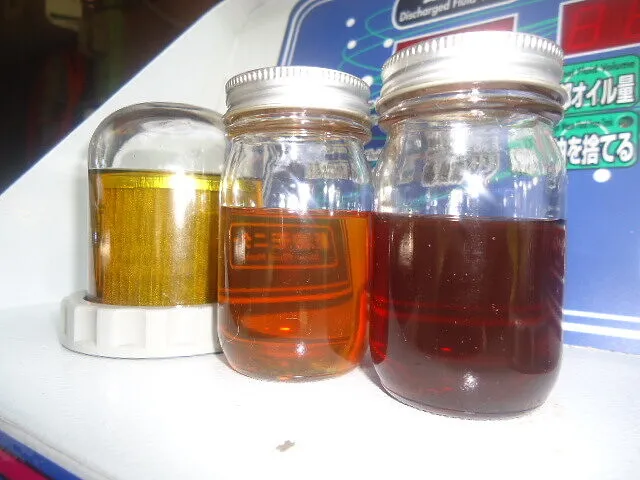 左のビンのドレンアウトしたオイルと比べて右の廃油モニター内のオイルが先ほどよりも透き通ってきましたね。