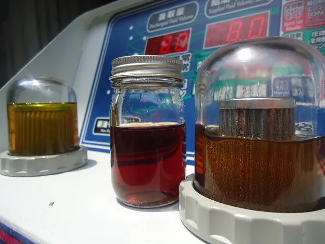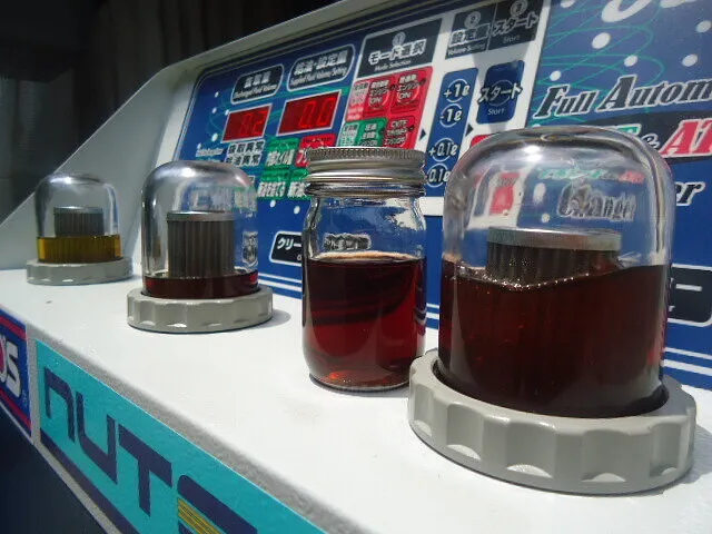 右のクリーナーモニター内のオイルが隣のビンのドレンアウトしたオイルと比べると気持ち色味が薄く変わっていますね。
