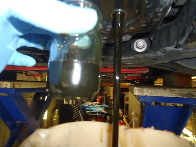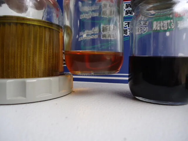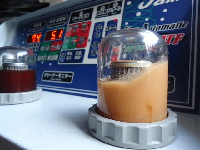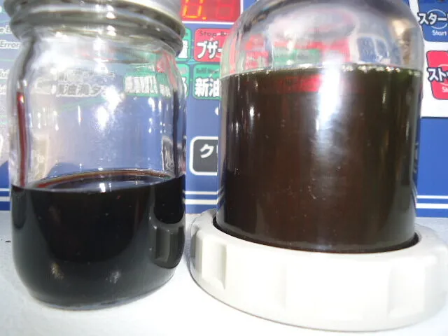 ビンのオイルパンから排出したATFとは透明感がまったくちがいますよね。