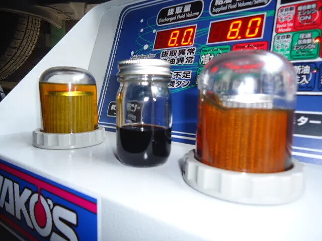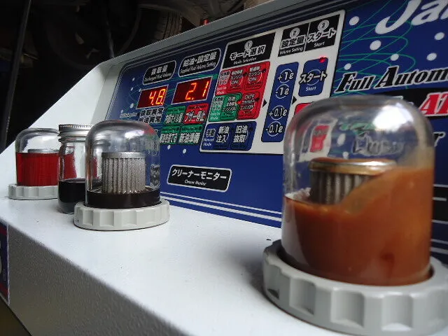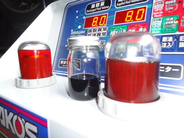 指示量の半分くらい交換中ですが、すでに右側の廃油モニター内の廃油が赤色になってきているのがおわかりでしょうか?