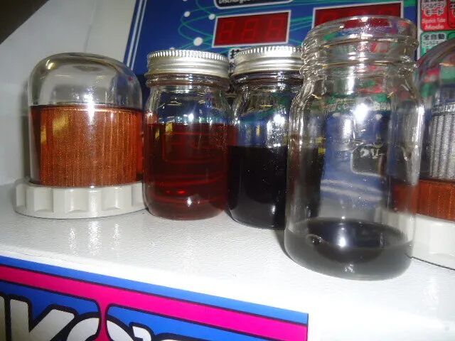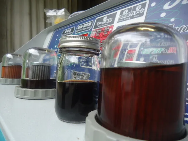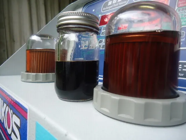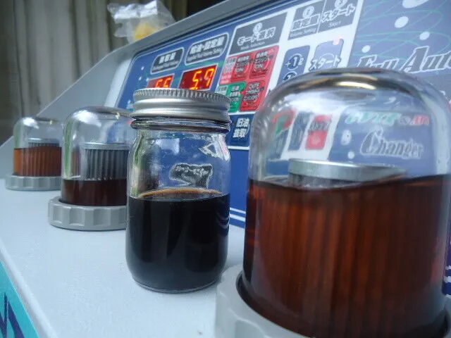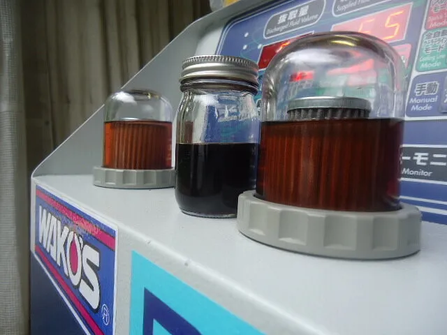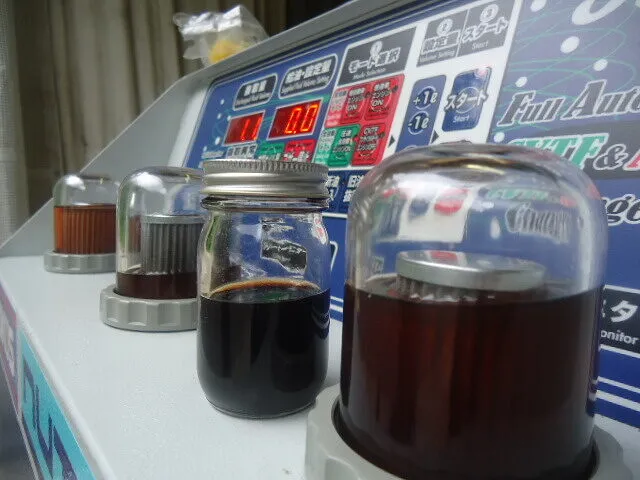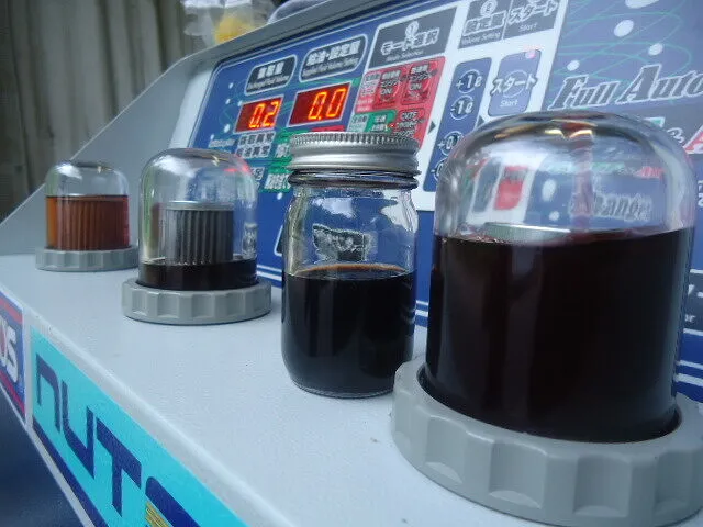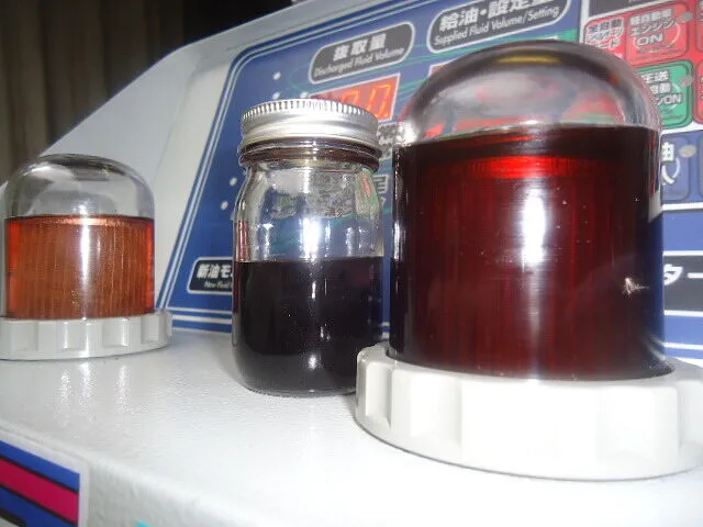 先ほどの透き通ったオイルと違い、右の廃油モニター内のオイルが真っ黒になり、ドレンアウトしたビンにためたオイルと同等の色になっていますね。