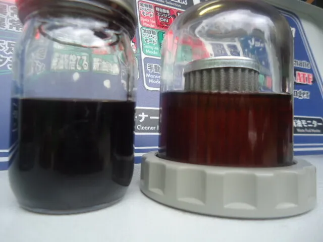 左から新油、交換後のミッション内のオイル、最初にドレンアウトしたオイル、クーラーラインの3回目の洗浄後排出した汚れです。