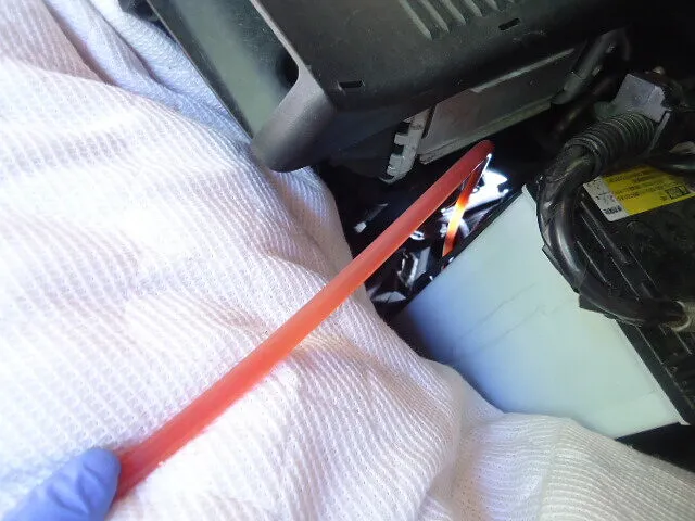 レベルゲージがとんでもなく奥にあるのでオイルを垂らさないように慎重に新油を注入します。