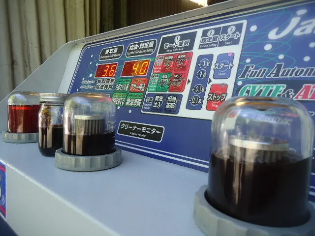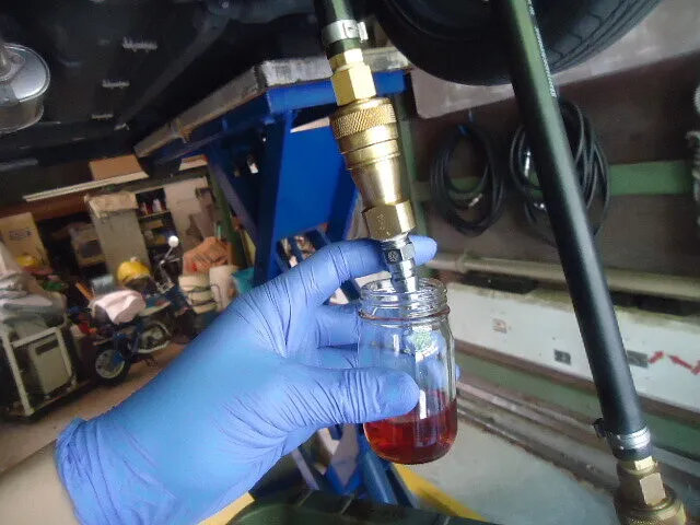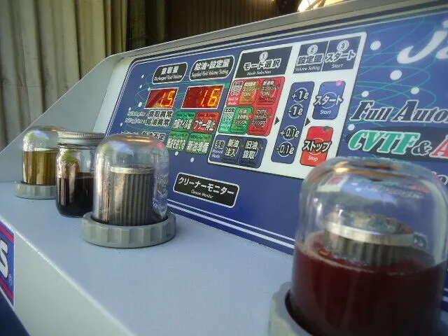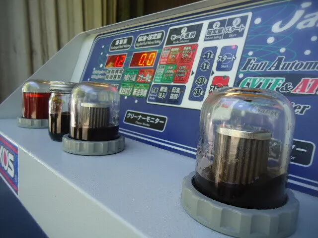 最初に車両内のATFが廃油モニターを通って廃油タンクに流れていくのですが、機械の構造上、軽自動車で圧送交換をする場合は少し工夫してやらないと圧送交換はできません。(機械が途中でエラーになる)