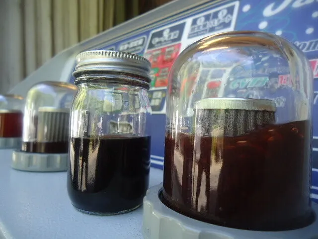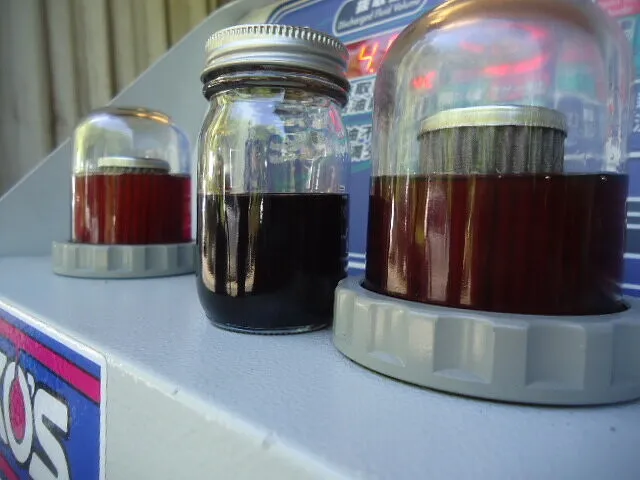 ビンのオイルと比べるとクリーナーモニター内のオイルは赤みはあり中のメッシュは見えてはいます。(フラッシュがたかれていないので写真ではわかりにくいです)