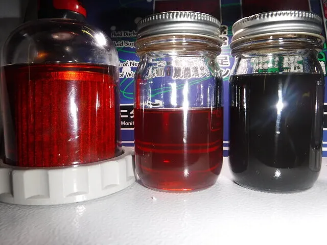 左からアイシンAFW+の新油、オーバーフロー時に採取した現在ミッションの中を流れているオイル、ドレンアウトしたオイルの順です。