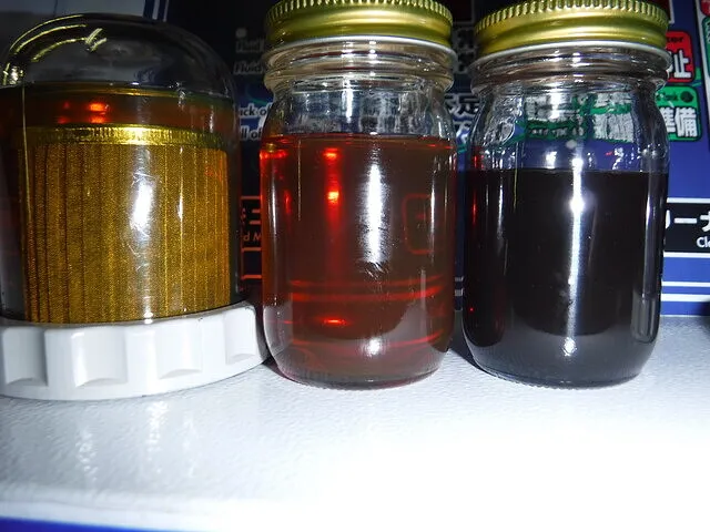 左から順に、ワコーズATFプレミアムスペックの新油、オーバーフロー時に採取した現在ミッションの中を流れているオイル、最初にドレンアウトしたオイルの順です。