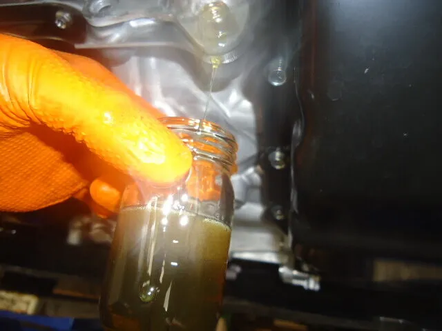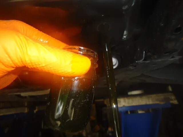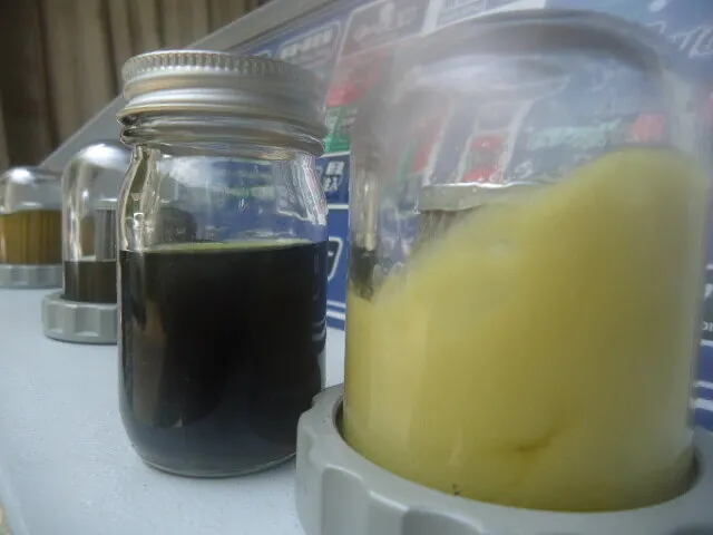 ビンに溜めたドレンアウトしたオイルが真っ黒に見えますが、元のフルードが青ですので汚れて黒いわけではありません。