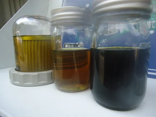 左からワコーズATFプレミアムスペックの新油、圧送交換後、アタッチメントを取り外す際に採取した現在ミッションの中を流れているオイル、最初にドレンアウトしたときに採取したオイルの順です。