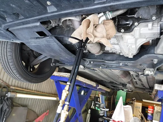 新油注入後、ATオイルクーラーを車両から取り外し、自作したアタッチメントを取り付けます。