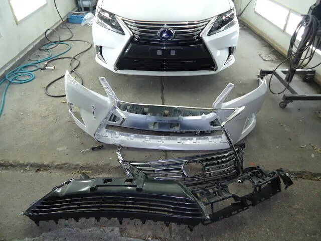 新品のバンパーにグリル、フォグユニットなどを組み付け、車両に装着しました。