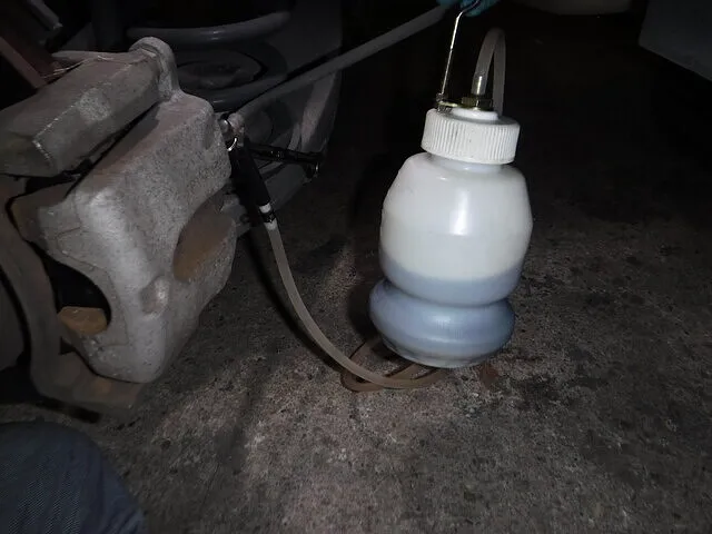 ブリーダーボトルをセットして、ブリーダーボルトを緩めると、勝手にブレーキフルードが圧送されてきます。