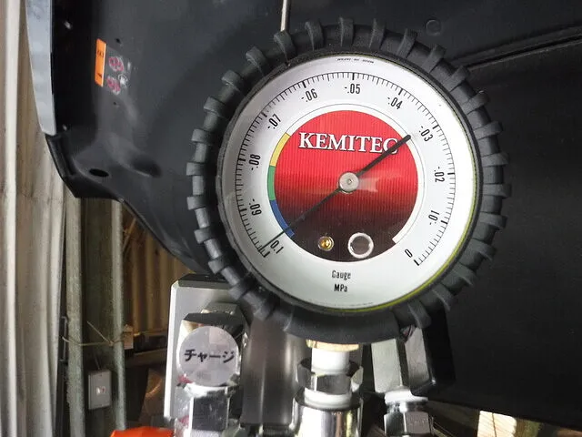 ケミテック製のバキュームチャージャーでしっかりと負圧をかけ、リークテスト後、チャージします。(ホンダ、バモスはこの方法がエア噛みがないのでおススメします)
